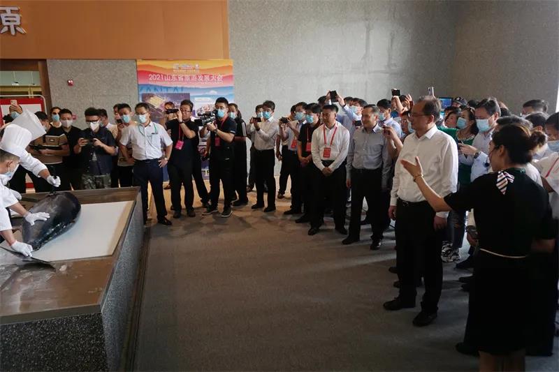 “咣!上魚嘍!”伴隨一聲嘹亮的吆喝,六人抬著一條200斤重的的金槍魚,送到展示廳廚師面前現(xiàn)場開魚,作為隆重又極具特色的海洋民俗文化,碩大的金槍魚在主刀廚師手里,僅僅幾分鐘就被去頭去尾,剔骨剝?nèi)?現(xiàn)場觀眾不禁叫絕。9月23日下午,2021山東省旅游發(fā)展大會參會代表一行來到芝罘灣商旅綜合體觀摩考察,打卡煙臺生態(tài)漁市文化新地標,體驗商旅融合多元休閑新場景。